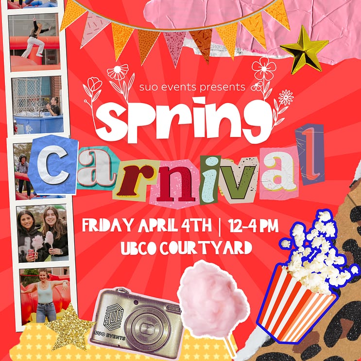 Join us for SUO’s Spring Carnival on Friday, April 4, from 11 AM – 4 PM in the UBCO Courtyard! 🎡✨